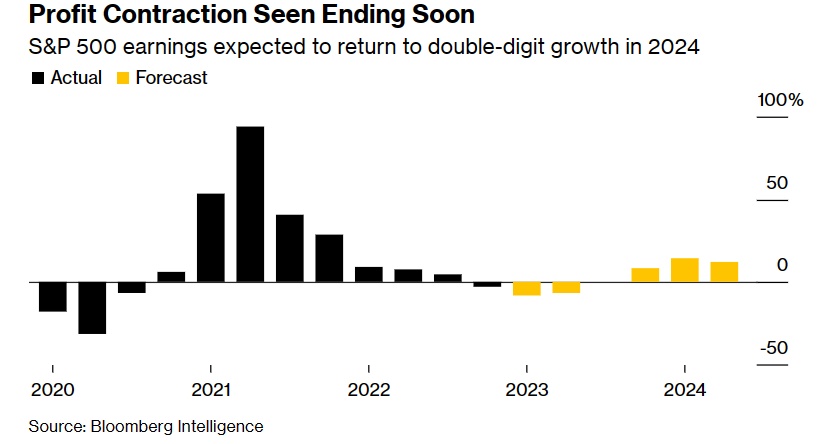利润收缩趋势不久后将结束——标普500指数利润水平预计将在2024年恢复两位数增长