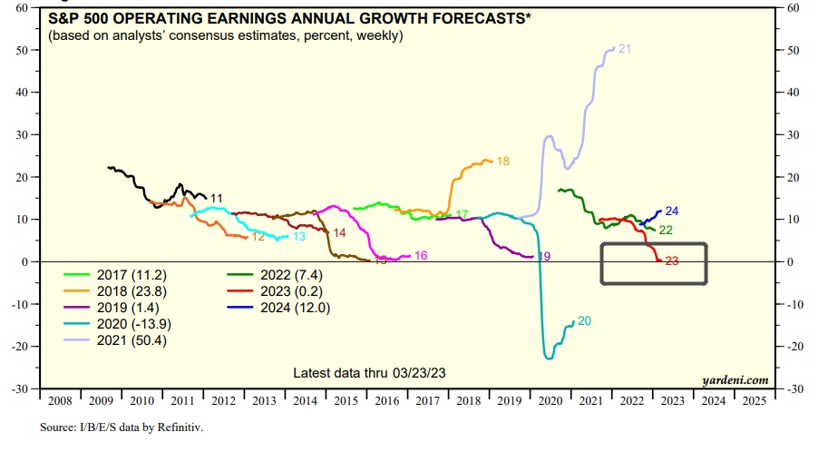 根据分析师的普遍预测水平,第一季度可能标志着企业盈利水平的阶段性低谷。分析师们普遍预计,从2022年底开始的利润收缩趋势预计将在今年下半年左右结束,并预期在2024年恢复两位数级别的增长趋势。市场往往提前半年左右的时间定价趋势线,但是,一些美股市场的看涨“信仰者们”可能已开始为乐观的利润趋势做准备工作。