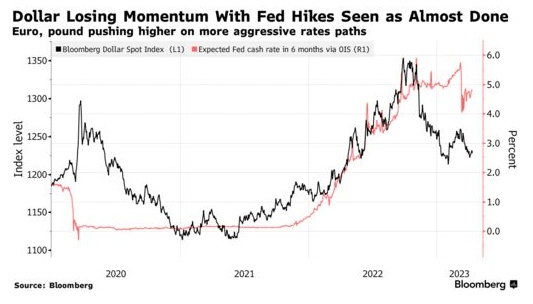由于美联储放慢了加息步伐,一项衡量美元兑一篮子主要货币汇率的美元现货指数自去年9月份创下历史新高以来已下跌近10%。欧元和英镑在过去一个月大涨,因交易员预计欧洲和英国央行将在未来六个月内提高现金利率,而美联储可能会在今年晚些时候降低借贷成本之前保持利率不变。