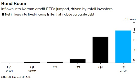 根据数据提供商KG Zeroin的数据,第一季度包括韩国公司债的ETF净流入量激增至3.2万亿韩元(24亿美元),而去年同期仅为680亿韩元。这23只ETF中,有一半以上是8月以来才推出的,这是零售投资者需求旺盛的标志。