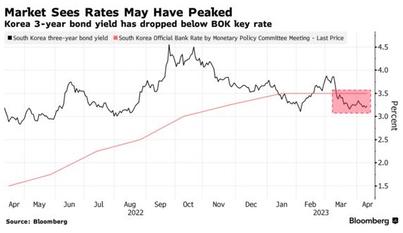 韩国在决策者将关键利率从2021年中期的0.5%提高到1月的3.5%之后,投资者越来越认为韩国央行已经完成了紧缩周期。三年期债券收益率现在已经降到了基准线以下,表明现在利率走势最可能的方向看起来是降低。