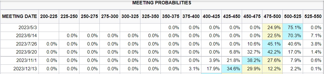 麦卡利所支持的美联储暂停加息预期与利率期货市场的预期相左,CME“美联储观察工具”显示,多数利率期货交易员押注5月为美联储本轮加息周期的尾声,预计加息幅度仍然为25个基点;CME这一工具显示5月美联储加息25个基点的可能性高达75%。