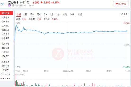 智通财经APP观察到,4月12日,百心安-B(02185)早盘飙升,股价最大涨幅达到75.42%,早盘成交量便超过300万股,成交额超过2000万港元,创下今年以来的新高。
