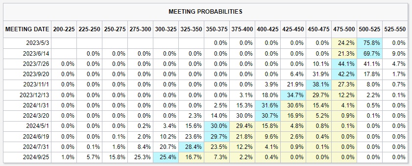 市场预计美联储下个月将把基准隔夜利率再提高25个基点,并发出是否有必要进一步加息的信号。根据CME“美联储观察工具”,市场目前预计美联储将于5月份会议上加息25个基点的概率达75.8%。美国劳动力市场依然强劲,而美国通胀目前又主要集中在劳动密集型行业,而根据一些研究,这些行业对加息最不敏感。这对美联储来说是个坏消息,可能会推动利率进一步走高。