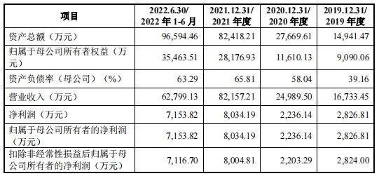 面对新能源汽车以及电化学储能等领域快速增长的市场需求,西典新能充分发挥自身竞争优势,实现电池连接系统、电控母排业务的快速发展,经营业绩和营业收入实现快速增长。于2019年度、2020年度、2021年度以及2022年1-6月,公司营业收入分别为1.67亿元、2.50亿元、8.22亿元和6.28亿元,归属于母公司所有者的净利润分别为2826.81万元、2236.14万元、8034.19万元和7153.82万元。