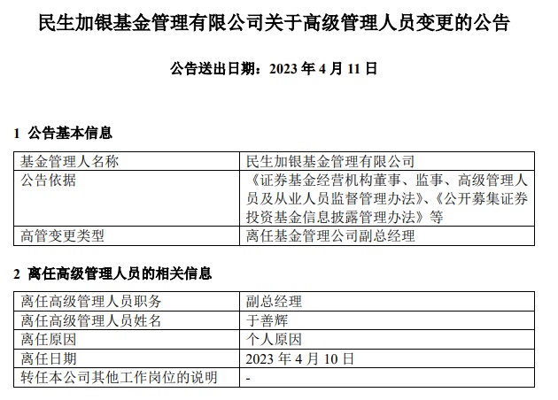 智通财经APP获悉,4月11日,民生加银基金发布其基金行业高级管理人员变更公告,副总经理于善辉离任,离任日期为4月10日。2022年,于善辉离任前在民生加银基金管理的6只产品业绩全部告负。据东方财富Choice数据,其中,民生加银康宁平衡养老(FOF)A和民生加银卓越配置6个月的2022年业绩几乎垫底,收益分别为-12.35%和-10.92%。