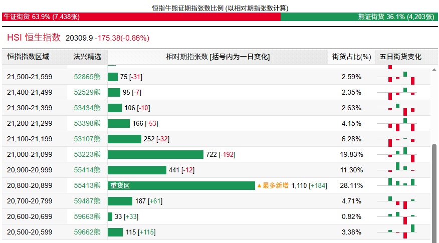 法兴恒指牛熊证街货分布图中的数据显示,熊证街货重货区在20800-20899区间,该区间最新熊证数量为1110张,较上一交易日增加184张。最多新增在同一区间。