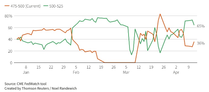 此外,在周三美国CPI数据公布后,交易员们加大了对美联储年底前降息的押注,同时下调了5月份加息的预期。与美联储会期挂钩的互换合约显示,交易员们对5月加息的预期回落到略高于三分之二的水平,同时对12月的预期显示届时有效联邦基金利率将比目前的4.83%低超过半个百分点,12月合约消化的利率为4.29%。