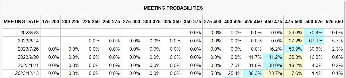 但分析人士普遍认为5月很可能是美联储本轮加息周期最尾端,预计此后美联储将暂停加息,主席鲍威尔届时将强调美联储仍保留加息选项,将根据实时数据商议利率水平。不过多数分析人士猜测在高基数前提下通胀率难以出现意外上行,且失业率有可能步入上行通道,因此5月极可能是本轮加息周期尾声。