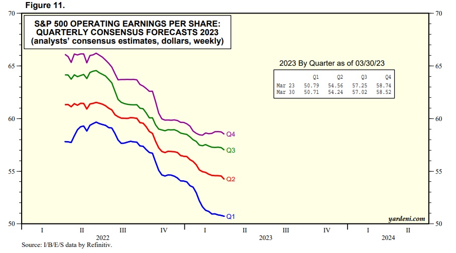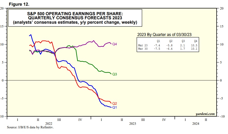 另一预期统计同样显示标普500指数成分公司利润下滑。据Bloomberg Intelligence汇编的分析师一致预期,标普500指数成分股公司今年1 - 3月的整体净利润预计将降至每股50.62美元,降幅大约8%——这将是自新冠疫情初期标普500指数暴跌31%以来最大幅度的利润降幅。知名市场研究机构Yardeni统计的市场预期数据显示,分析师们对于2023年标普500成分公司的每股营业利润,尤其是该利润的增速预期不断下调,对于Q1和Q2增速预期已经进入负值区域。