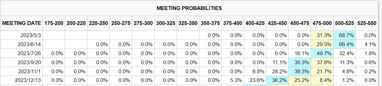 尽管一些美联储官员曾表示,年底前利率可能会维持在目前4.75% - 5%的水平,但利率期货市场显示,交易员们押注美联储将采取更为温和的宽松政策路线,预计从今年夏天开始降息。CME“美联储观察工具”显示,近期利率期货市场预期美联储在5月政策会议上将基准利率上调25个基点的几率为68%,远高于一周前的45%左右,而市场预期今年底利率降至4.5%以下的几率超过50%,即预期年前美联储将降息大约50个基点。