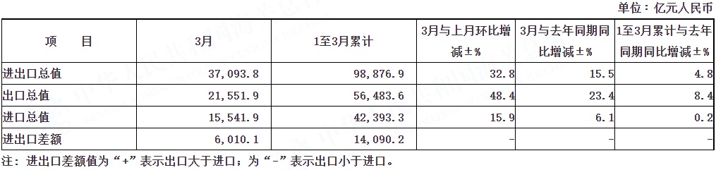 智通财经APP获悉,海关总署4月13日发布的数据显示,中国3月进出口差额6010.1亿元。3月出口总值21551.9亿元,同比增长23.4%,环比增长48.4%,3月进口15541.9亿元,总值同比增长6.1%,环比增长15.9%。