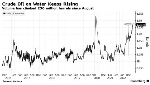 这一增长反映了俄乌冲突后全球石油市场的重铸。自去年8月以来,这一数字增加了近2.3亿桶,因为俄罗斯将供应转给更远的买家,特别是印度和中国,而欧洲不得不从其他地方拉来更多的原油。此外,美国创纪录的出口延长了船只运送物资的距离。