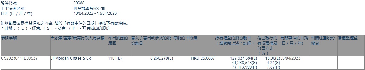 智通财经APP获悉,香港联交所最新资料显示,4月6日,小摩增持再鼎医药(09688)826.627万股,每股作价25.6887港元,总金额约为2.12亿港元。增持后最新持股数目约1.28亿股,最新持股比例为13.06%。