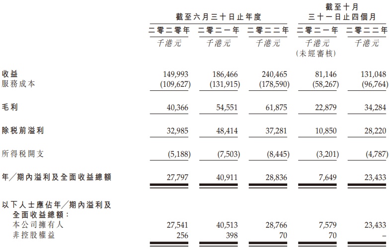 财务方面,截至2020年、2021年、2022年6月30日止年度及2022年10月31日止四个月,怡俊集团营收分别约为1.5亿、1.86亿、2.4亿及1.31亿港元;同期,期内净利润分别为2779.7万、4091.1万、2883.6万及2343.3万港元。