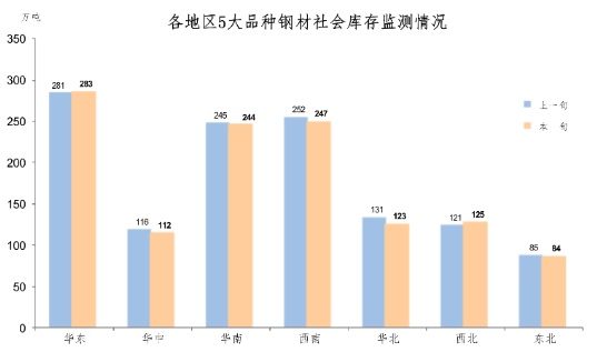 4月上旬,分地区来看,七大区域钢材社会库存各有升降,具体情况为:华北地区库存环比减少8万吨,下降6.1%,仍为减量和降幅最大地区;西南减少5万吨,下降2.0%;华中减少4万吨,下降3.4%;东北减少1万吨,下降1.2%;华南减少1万吨,下降0.4%;西北库存增加4万吨,上升3.3%;华东增加2万吨,上升0.7%。