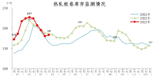 4月上旬,热轧板卷库存183万吨,环比增加3万吨,上升1.7%,库存连续4旬下降后小幅回上升;比年初增加26万吨,上升16.6%;比上年同期减少3万吨,下降1.6%。