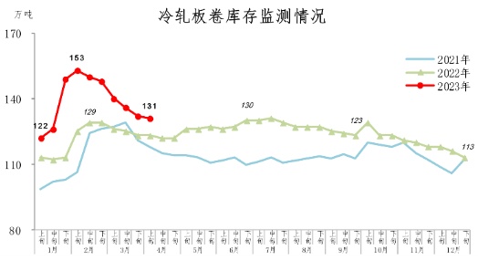 4月上旬,冷轧板卷库存131万吨,环比减少1万吨,下降0.8%,库存变化不大;比年初增加18万吨,上升15.9%;比上年同期增加8万吨,上升6.5%。