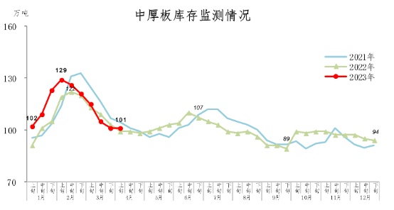 4月上旬,中厚板库存101万吨,环比持平;比年初增加7万吨,上升7.4%;比上年同期增加2万吨,上升2.0%。