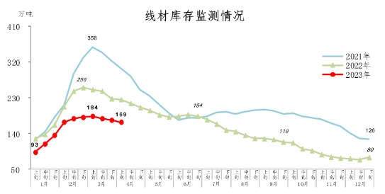 4月上旬,线材库存169万吨,环比减少5万吨,下降2.9%,库存连续小幅下降;比年初增加89万吨,上升111.3%;比上年同期减少57万吨,下降25.2%。