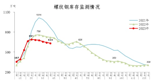 4月上旬,螺纹钢库存634万吨,环比减少10万吨,下降1.6%,库存降幅收窄;比年初增加326万吨,上升105.8%;比上年同期减少88万吨,下降12.2%。
