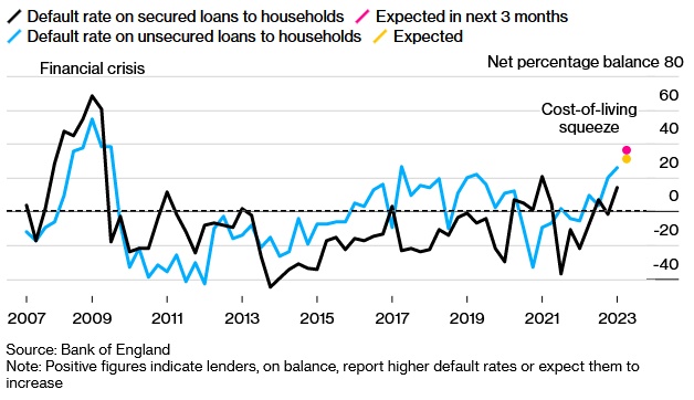 智通财经APP获悉,英国央行的季度信贷状况调查显示,第一季度抵押贷款、家庭无担保信贷和中小企业贷款的违约率都有所上升,且预计还会进一步上升,英国银行预计将在未来几个月对抵押贷款市场施加压力。这表明,高达两位数的通胀以及英国央行自2021年底以来前所未有的一系列加息使得数百万房主不得不支付额外的抵押贷款。