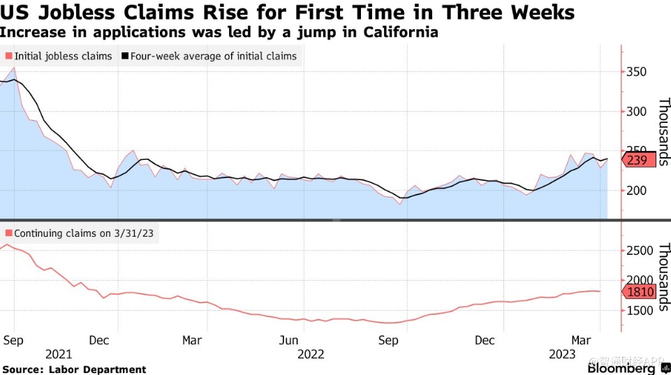 智通财经APP获悉,美国初请失业金人数三周来首次上升,主要原因是加州失业人数激增,并表明劳动力市场进一步走软。美国劳工部周四公布的数据显示,截至4月8日当周初请失业金人数增加1.1万人,至23.9万人,经济学家预期为23.5万人。不过,初请失业金人数仍低于27万人,分析师称超过这一水准,将暗示就业市场恶化。