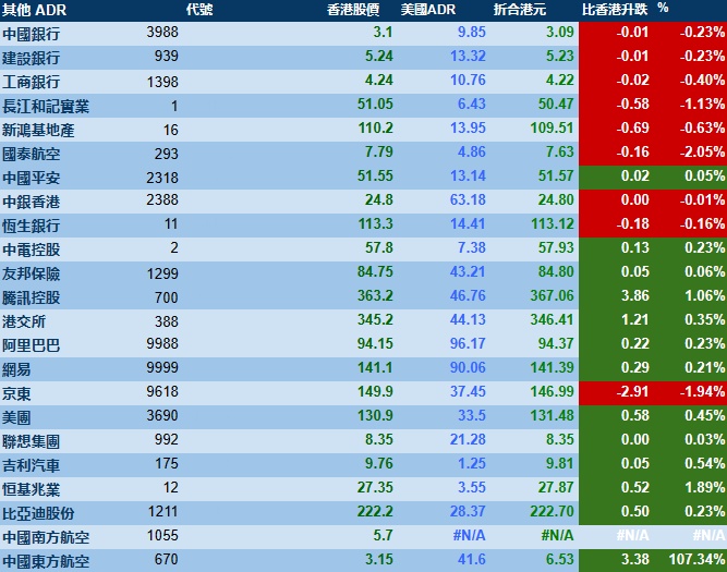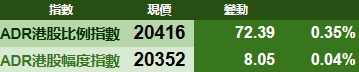 智通财经APP获悉,周四美股三大指数集体收涨,港股ADR指数上涨,按比例计算,收报20416点,较香港收市涨72.39点或0.35%。