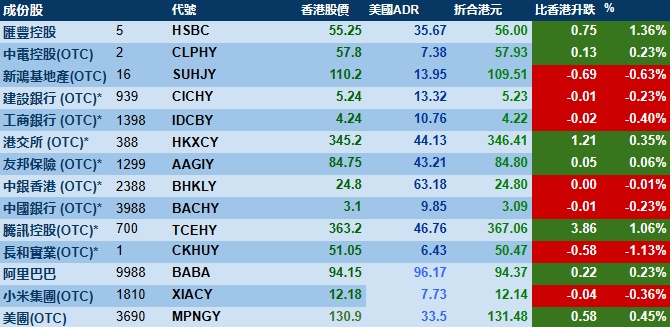 大型蓝筹股涨跌不一,汇丰控股收报56.00港元,较港收市涨1.36%;腾讯控股收报367.06港元,较港收市涨1.06%。