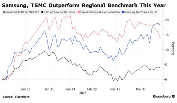全球芯片类股已从10月份的低点反弹,三星和台积电今年以来分别上涨了20%和14%。这提振了韩国和台湾等以科技为主的市场,帮助它们在经历了一年的表现不佳后,在2023年击败大多数新兴市场同行。