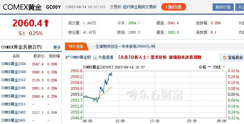 智通财经APP获悉,4月14日,港股中国黄金国际(02099)和灵宝黄金(03330)涨超5%,山东黄金(01787)涨近5%,紫金矿业(02899)和招金矿业(01818)涨超2%。基本面上,截至发稿,COMEX黄金涨5.1美元,报2060.4美元/盎司,为去年3月来最高水平。分析指出,美国经济今年可能陷入衰退,以及美联储停止加息或导致未来几年通胀持续高企,创造了一个有利于金价上涨的环境。中金公司认为,金价已进入右侧上行通道,并有望达到2300美元/盎司至2500美元/盎司甚至以上。