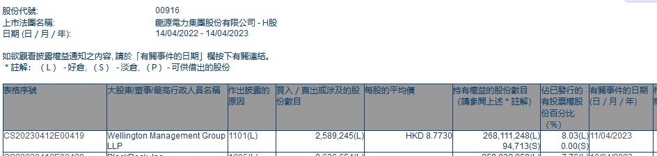 智通财经APP获悉,香港联交所最新资料显示,4月11日,Wellington Management Group LLP增持龙源电力(00916)258.9245万股,每股作价8.7730港元,总金额约为2271.54万港元。增持后最新持股数目约为2.68亿股,最新持股比例为8.03%。