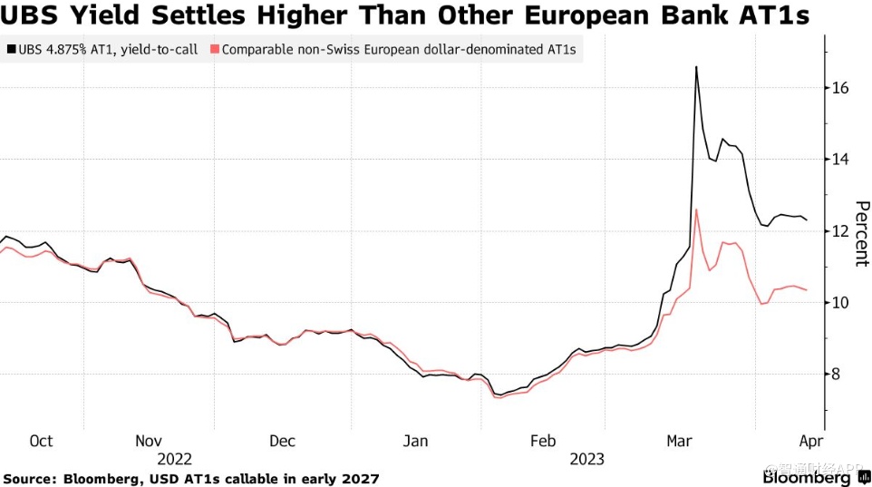 在瑞信债券减记之后,瑞士银行AT1债券的收益率仍远高于其他欧洲同行。投资者对瑞银2027年初到期的15亿美元债券所要求的收益率超过12%,比非瑞士发行人的类似债券的收益率高出约200个基点。