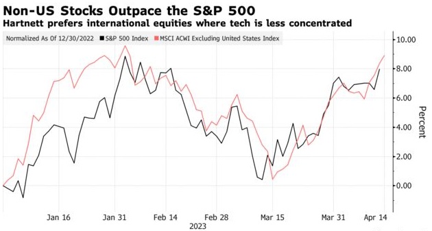 Hartnett去年一直正确地看空股市,他警告称,对经济衰退的担忧将加剧股票资金外流。如今,他更青睐美国以外的股票。他说,在借贷成本上升的背景下,与经济增长相关、较便宜的国际股票的表现将超过昂贵的美国成长型股票,如欧洲、日本和新兴市场银行等。