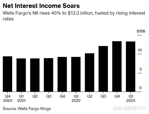 智通财经APP获悉,富国银行(WFC.US)公布2023年第一季度业绩。数据显示,富国银行Q1营收为207.29亿美元,同比增长17%,好于市场预期;净利润为49.91亿美元,同比增长32%;摊薄后每股收益为1.23美元,超出市场预期,上年同期为0.91美元。