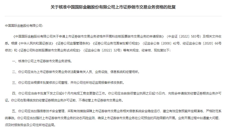 证监会核准中金公司(601995.SH)上市证券做市交易业务资格