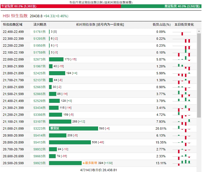 智通财经APP获悉,截至4月15日,恒指最新的牛熊街货比例为60:40。