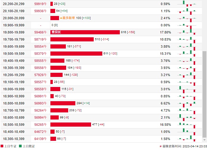 牛证街货重货区在19800-19899区间,该区间最新牛证数量为816张,较上一交易日减少158张;最多新增在20000-20099区间,该区间最新牛证数量为100张,较上一交易日增加100张。