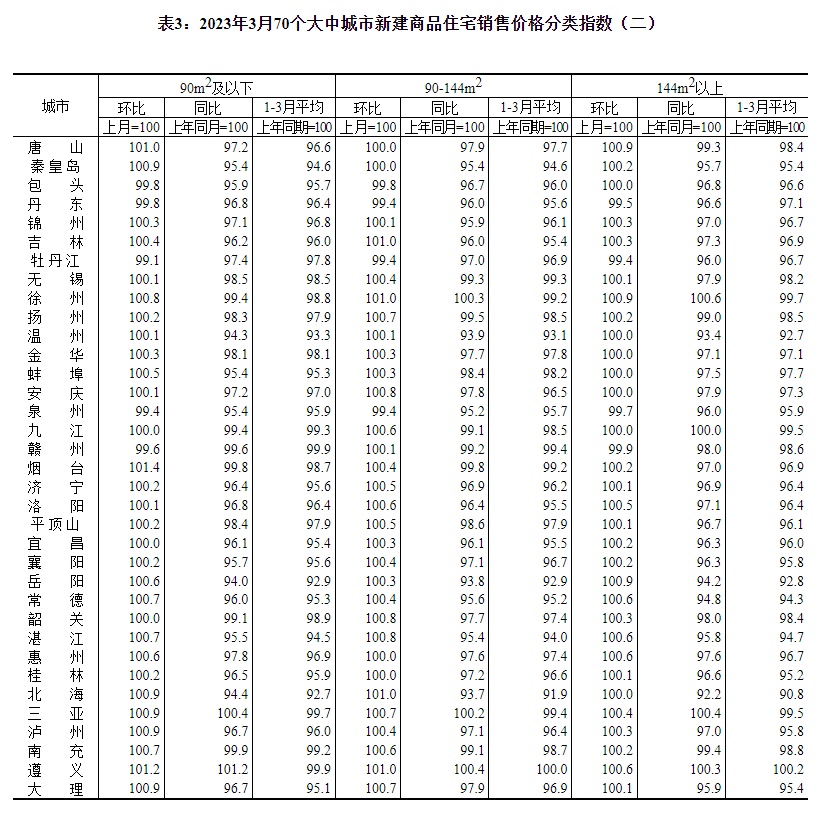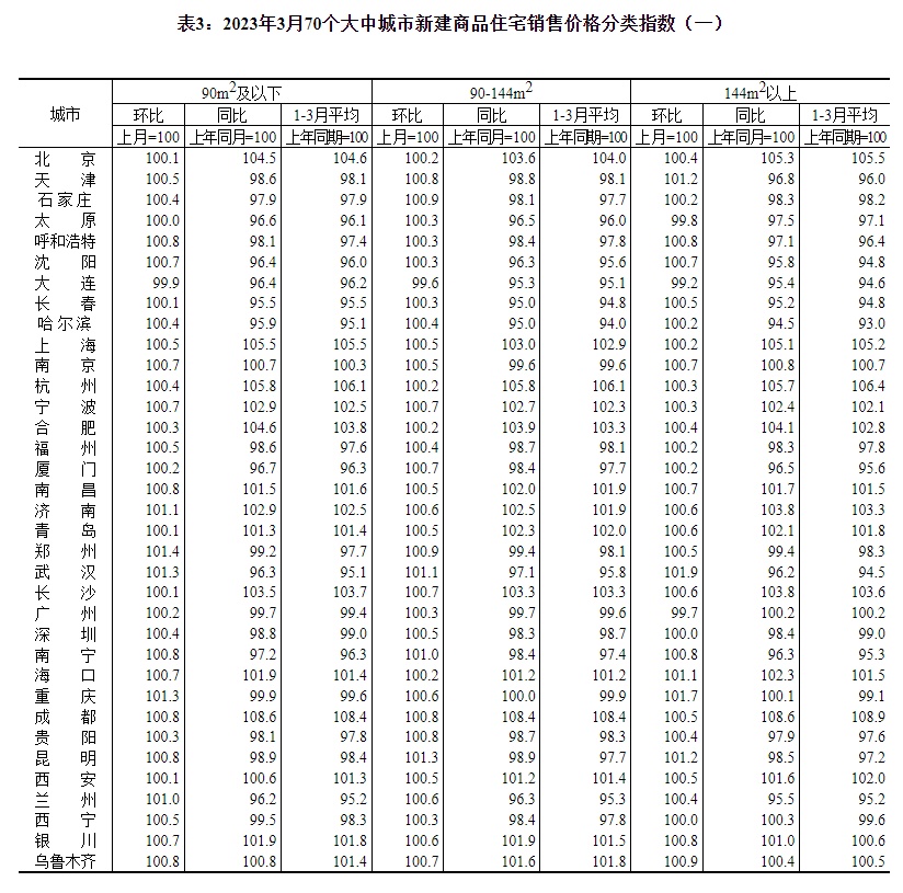 3月份,70个大中城市中,新建商品住宅和二手住宅销售价格环比上涨城市分别有64个和57个,比上月分别增加9个和17个。3月份,一线城市新建商品住宅销售价格环比上涨0.3%,涨幅比上月扩大0.1个百分点;二手住宅销售价格环比上涨0.5%,涨幅比上月回落0.2个百分点。二线城市新建商品住宅和二手住宅销售价格环比分别上涨0.6%和0.3%,涨幅比上月均扩大0.2个百分点。三线城市新建商品住宅销售价格环比上涨0.3%,涨幅与上月相同;二手住宅销售价格环比由上月持平转为上涨0.2%。