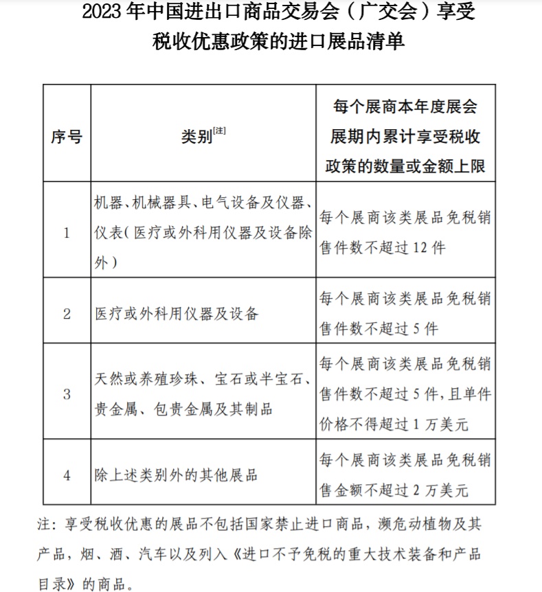 一、对2023年举办的广交会在商务部确定的展期内销售的免税额度内的进口展品免征进口关税、进口环节增值税和消费税。每个展商在本年度展会展期内累计享受税收优惠的展品类别、销售数量或金额上限按附件规定执行。
