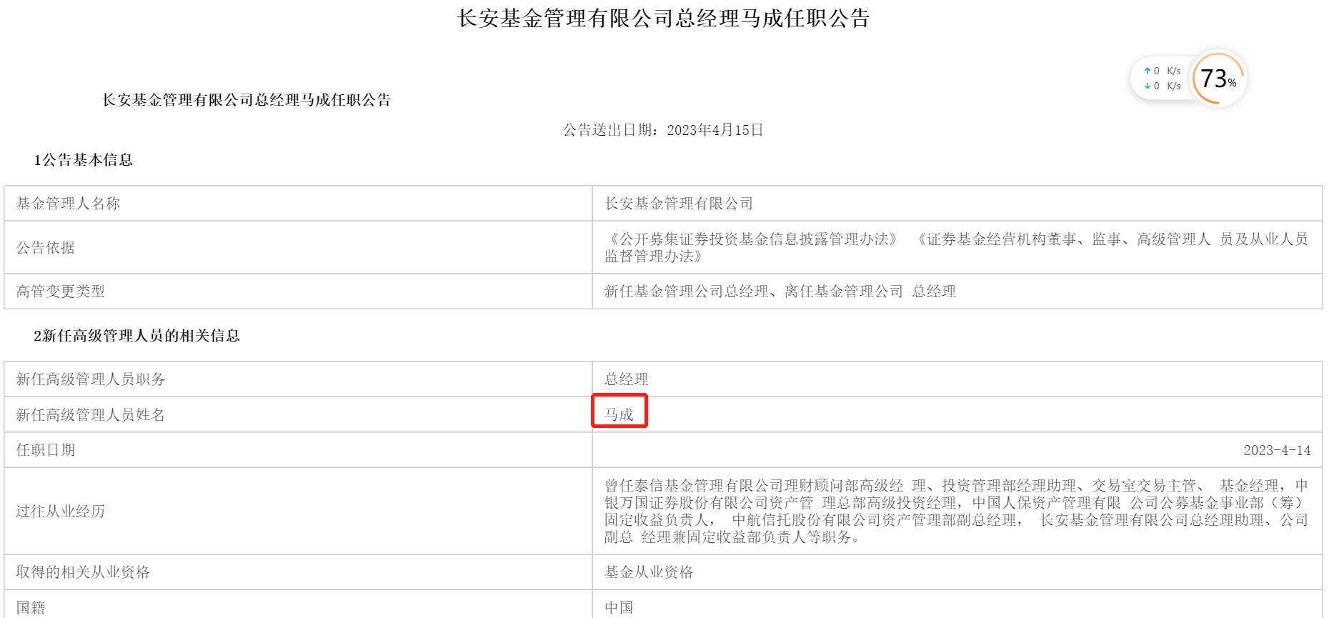 智通财经APP获悉,4月15日,长安基金发布公告称,原总经理汪钦因个人原因提出离职,离职日前为4月14日。这也证实了日前市场对长安基金总经理变更的传闻。同时,公告显示,马成自2023年4月14日正式出任长安基金总经理一职。