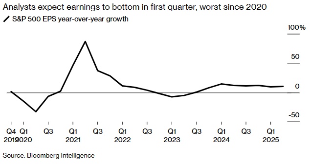 策略师Gina Martin Adams和Wendy Soong表示,据Bloomberg Intelligence汇编的分析师一致预期,标普500指数成分股公司今年第一季度的整体净利润预计将降至每股50.62美元,降幅大约8%——这将是自新冠疫情初期标普500指数暴跌31%以来最大幅度的利润降幅。