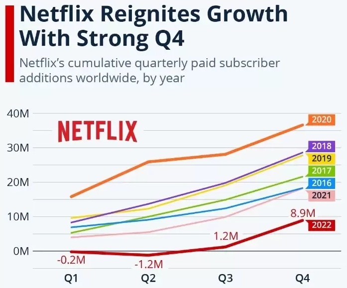 奈飞在2022年第一和第二季度的使用量都出现了负增长,该公司的股价在2022年的前五个月中下滑了68%。再加上2022年的宏观不利因素,奈飞意识到其无广告业务无法持续,因为用户增长放缓和拍摄成本上升吞噬了利润率。虽然由于亚马逊Prime、迪斯尼+和YouTube等对手的激烈竞争,年度用户增长放缓,但从2022年第三季度开始,奈飞的新用户又有所回升。