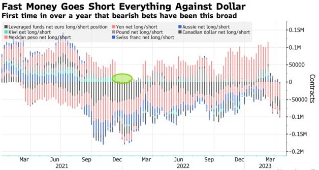智通财经APP获悉,此前投资者将美联储降息预期推高至极端水平,但对冲基金目前押注美元近三年来持续时间最长的度周下跌趋势即将逆转。根据美国商品期货交易委员会(CFTC)的最新数据,上周杠杆基金对所有主要货币兑美元的汇率都出现了净做空,这是自2022年1月以来的首次。尽管衡量投资者整体仓位的指标仍是看空美元,但对冲基金的普遍乐观情绪可能表明,对银行业危机对美联储抗击通胀意愿影响的担忧正在消退。