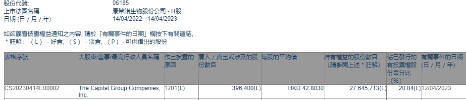 智通财经APP获悉,香港联交所最新资料显示,4月12日,美国资本集团增持康希诺生物(06185)39.64万股,每股作价42.8030港元,总金额约为1696.71万港元。减持后最新持股数目约为2764.57万股,最新持股比例为20.84%。