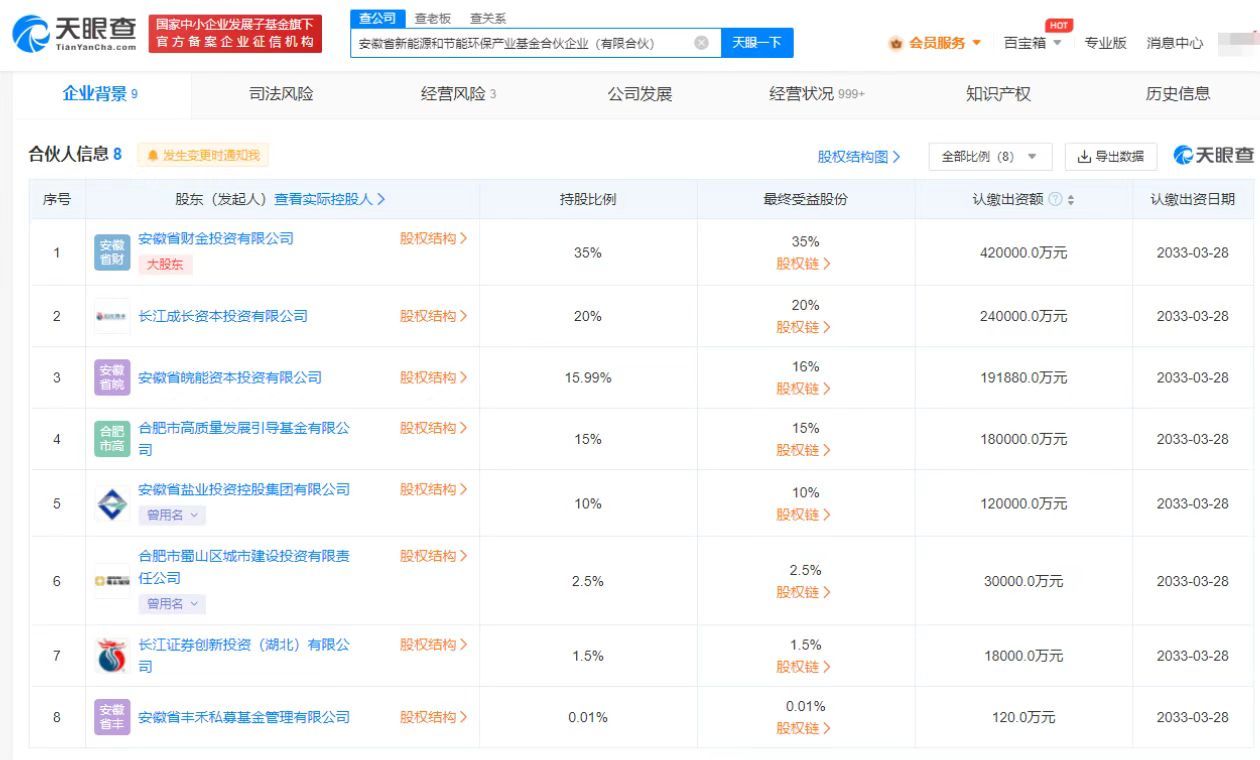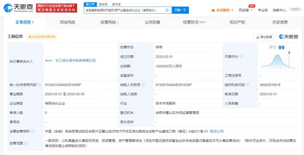 智通财经APP获悉,天眼查App显示,近日,安徽省新能源和节能环保产业基金合伙企业(有限合伙)成立,执行事务合伙人为长江成长资本投资有限公司,出资额120亿人民币,经营范围包括以私募基金从事股权投资、投资管理、资产管理等活动。合伙人信息显示,该公司由安徽省财金投资有限公司、长江证券全资子公司长江成长资本投资有限公司、安徽省皖能资本投资有限公司等共同持股。