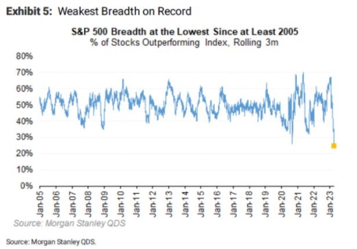 Wilson表示,在三个月的滚动基础上,跑赢标普500指数的股票比例是有记录以来最低的。这位策略师在一份报告中写道,这“是市场在警告我们,我们还远远没有走出熊市困境”。据了解,这位策略师在《机构投资者》调查中因正确预测股市暴跌而排名第一。
