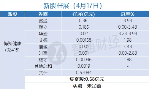 智通财经APP获悉,梅斯健康(02415)正在招股中,截至4月17日,富途、辉立等合计为梅斯健康借出孖展近0.57084亿港元,认购未足额。
