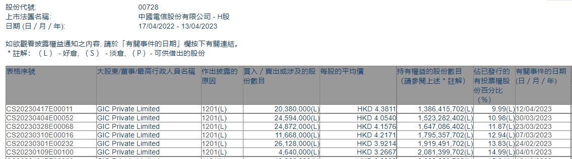Private Limited累计减持中国电信金额约4.6亿港元。