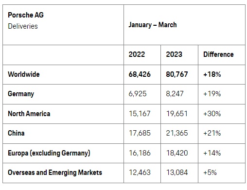 该豪华汽车制造商将第一季度强劲的整体数据归功于北美交付量增长30%至19,651辆,以及中国市场的复苏。随着中国摆脱由新冠疫情引起的封锁,中国同期的交付量增至21,365辆,比去年增长21%。据该公司称,欧洲市场的交付量也增长了约14%,而全球新兴市场的销量仅增长了5%。在第一季度,保时捷在德国市场交付的车辆数量也上升至 8,247 辆,增加了 19%。